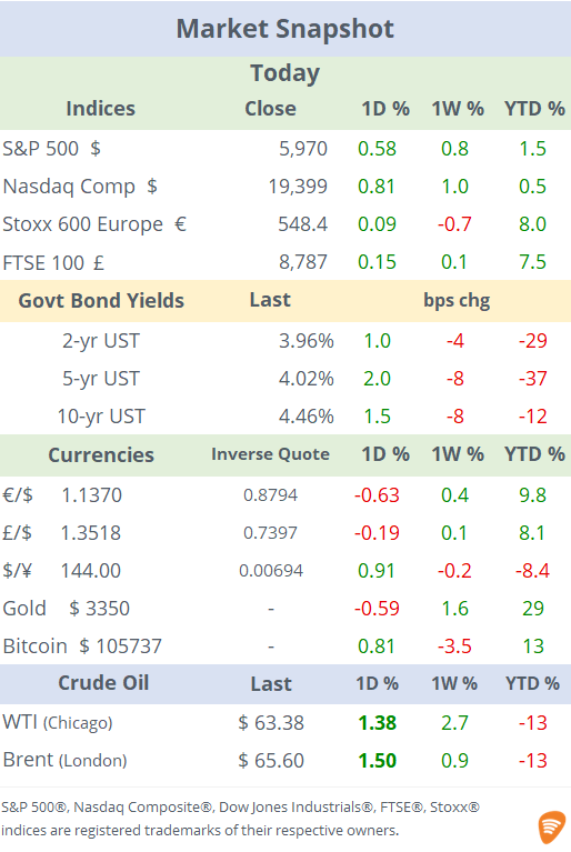 It was another positive day for risk assets with leading US indexes gaining between 0.6 and 1.6% with the small-cap Russell index outperforming its peers and the S&P 500 and Nasdaq benchmarks up year-to-date as the market more than recovers from the steep tariffs sell-off in April. Demand for chip giants Nvidia, Broadcom, Micron and Applied Materials, helped the semiconductor sector outperform. Also, a strong earnings update before the market open by retailer Dollar General, helped sentiment.