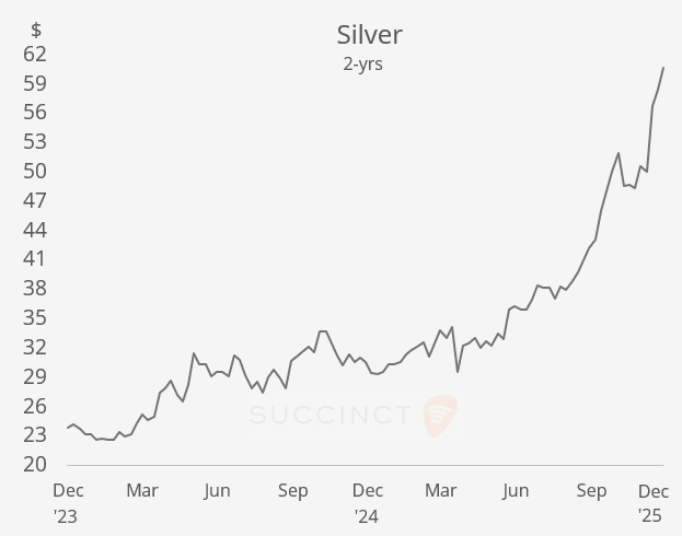 Silver surged to fresh all-time highs, breaking above the $60 level, as momentum buying and safe-haven flows intensified.