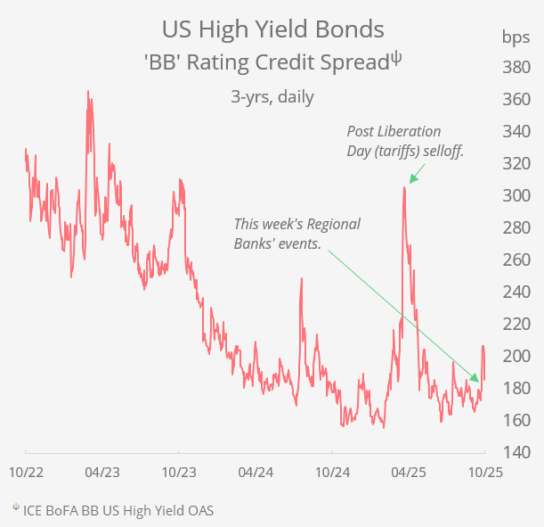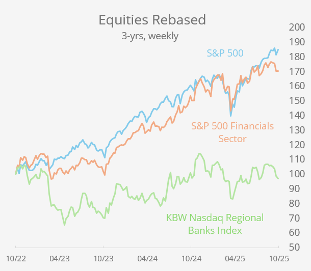 US regional banking stocks fell sharply on Thursday, rattling investors and reigniting concerns about credit quality in the broader market. Shares of Zions Bancorp (mcap $7.3bn) dropped over 13% (-8% YTD) after the bank announced a $50mn charge-off on two troubled loans issued through a subsidiary. Western Alliance Bancorp (mcap $8bn) similarly revealed exposure to a fraudulent borrower, sending its stock down 10% (-13% YTD). Even Jefferies Financial Group (mcap $11bn), a Wall Street investment bank, fell ~9% (-34% YTD) as worries over off-balance-sheet lending and shadow banking practices amplified caution among investors.