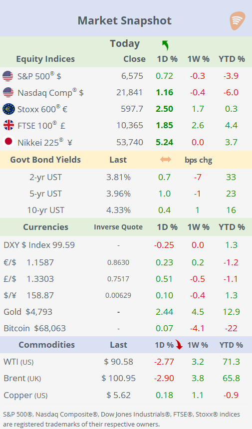 Global markets extended their risk-on rebound, with equities rallying for a second consecutive session on growing optimism that the conflict with Iran may be nearing an end. The so-called “Hormuz Hope” rally gained traction as oil prices continued to decline, reflecting easing fears around supply disruptions despite the Strait of Hormuz remaining largely constrained. Sentiment was further supported by comments from Iran’s president, Pezeshkian, signalling openness to de-escalation, alongside expectations that Trump will outline a potential timeline for ending the war in a rare primetime address later tonight (at 9 PM ET).