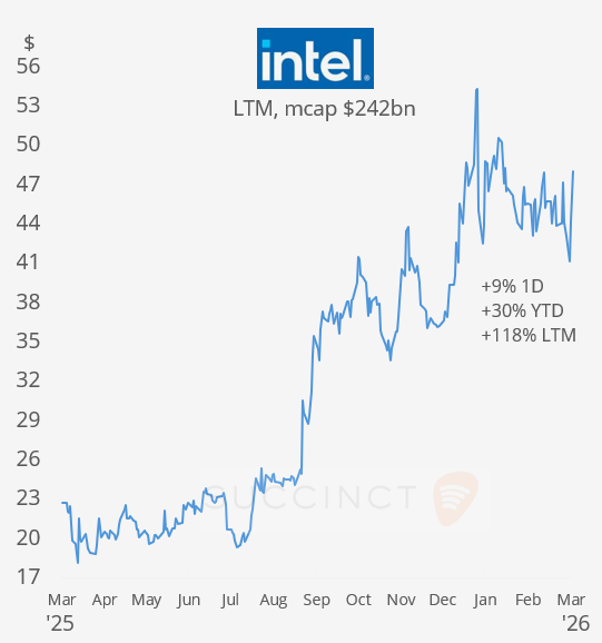 → Intel (mcap $242bn) will acquire Apollo’s 49% stake in its Ireland Fab 34 facility for $14.2bn, fully consolidating the chip manufacturing asset. The deal, funded with cash and ~$6.5bn of new debt, unwinds Apollo’s 2024 financing and is expected to support Intel’s earnings and credit profile from 2027. Intel shares rallied 9% today and accumulated a 30% return YTD.