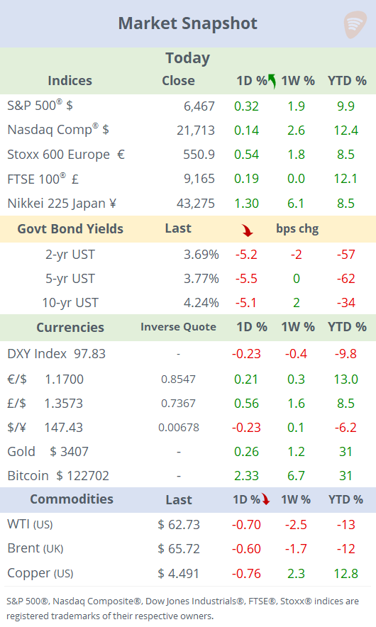 Chinese online giant Tencent (mcap $690bn) beat top and bottom estimates, delivered strong Q2 results, powered by growth in gaming, AI-driven marketing, and heavy reinvestment in AI infrastructure. Shares advanced almost 5% in Hong Kong to accumulate a 40% gain YTD.