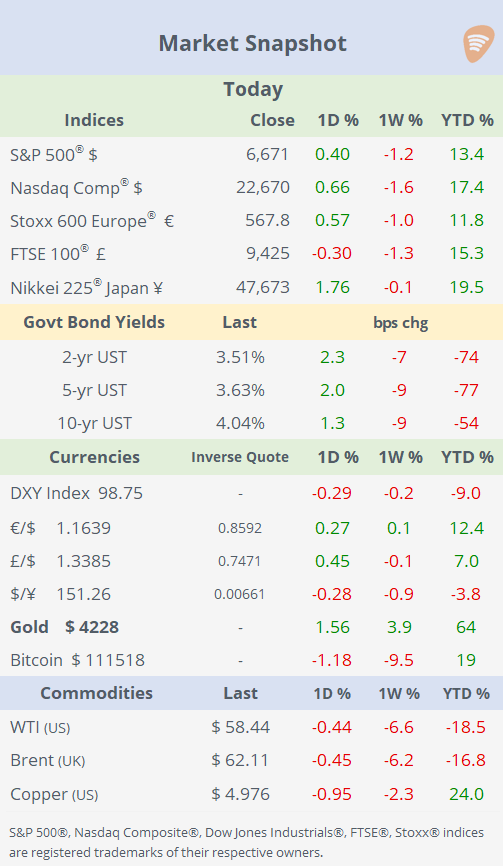 Central Banks: The Fedโ€™s Beige Book reported that US economic activity was little changed in recent weeks, with employment levels mostly stable and mixed signals on input costs and consumer spending. Fed officials Miran and Bostic spoke today, emphasising the need for additional rate cuts amid increased downside risks to growth. Miran highlighted the urgency of moving quickly toward a more neutral policy stance to reduce vulnerability to economic shocks, while Bostic pointed to ongoing labour market concerns supporting a cautious but dovish approach on rates.