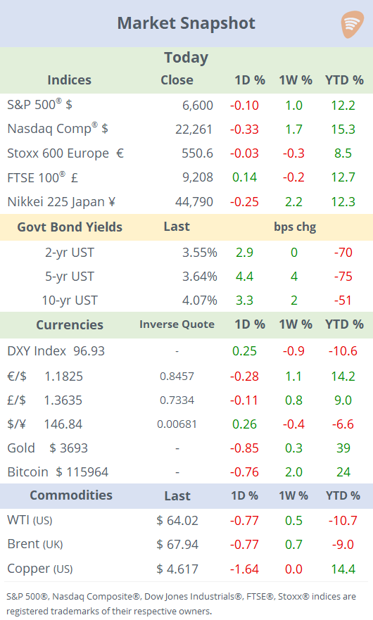 The Bank of Canada also cut its policy rate by 25bp to 2.50% as expected, its first reduction in six months, citing a weakening job market, reduced inflationary pressures, and the removal of many retaliatory tariffs. It signalled it’s ready to ease further “one meeting at a time” if risks rise, especially watching how exports, business investment and inflation trends evolve. Core inflation remains near the top of its 1-3% target but appears to be easing. The yield on three-year Canadian bonds has been shifting downwards in the past four weeks to 2.53%.
