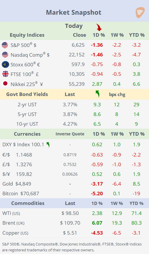 Global markets saw a notable shift to risk-off as geopolitics and monetary policy collided. Tensions escalated after Israel struck Iran’s South Pars gas field, the world’s largest, while Tehran retaliated by targeting regional energy infrastructure, raising concerns over supply disruptions across the Gulf. Oil surged, with Brent jumping 6% to around $110, its highest since mid-2022, intensifying fears of a renewed energy shock feeding into global inflation.