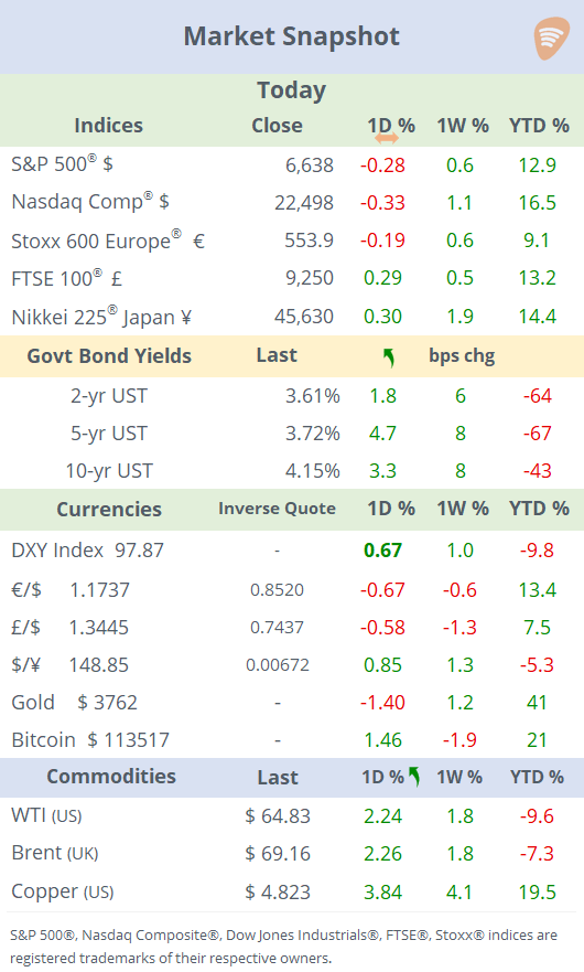 Equity indices fell for a second straight day from their recent all-time highs, with the small-cap Russell 2000 leading the decline. Sector performance was mixed, as energy held up best while materials lagged. Market attention remains fixed on the prospects for interest rate cuts, with comments from Fed officials this week highlighting growing disagreement over the policy path amid signs of weakness in the employment market. Investors now look ahead to Friday’s PCE inflation report for the next major data test.
