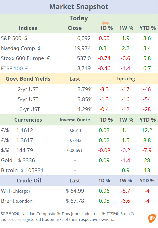 With the Israel–Iran truce holding, markets had a relatively calm Wednesday while Trump flies to The Netherlands to attend the NATO Summit. Leading US stock indices ended mixed and little changed, still very close to their record highs. The exception was the small-cap sector with the Russell 2000 losing over 1% as investors rotated out of the sector and into large caps mainly driven by hawkish comments by Fed Chair Powell regarding the interest rate outlook.