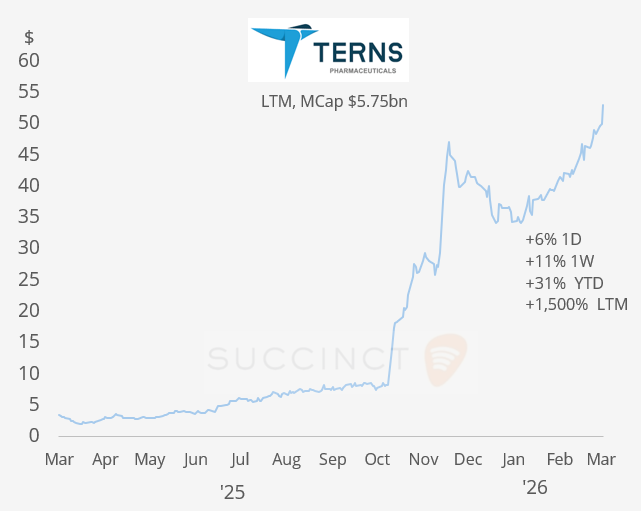 Corporate Deals: → In the US pharma sector, Merck & Co. (mcap $294bn) has agreed to acquire Terns Pharmaceuticals (mcap $5.7bn) for ~$5.7bn (or $53/share), gaining a promising experimental leukaemia treatment to strengthen its oncology pipeline. The deal reflects Merck’s push to offset the upcoming patent expiry of Keytruda in 2028, securing future growth through new cancer therapies. Terns shares gained 6% today and are +31% YTD.