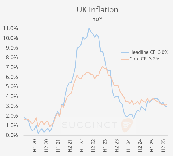 Economics: → UK headline CPI inflation rose +0.4% MoM and +3.0% YoY, broadly stable and in line with expectations. Core CPI printed at 3.2% YoY (vs 3.1% prior and expected), indicating a slight upside surprise and suggesting underlying inflation pressures are not easing further. Overall, the data points to sticky core inflation, likely reinforcing a cautious stance from the Bank of England on the timing of rate cuts.