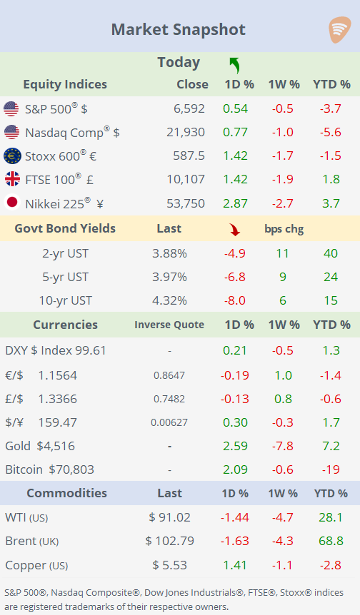 Markets remain highly reactive this Wednesday, with sentiment still dominated by the evolving conflict in the Middle East. After several sessions of sharp swings, risk assets found some footing as crude, particularly Brent, pulled back on tentative hopes of a de-escalation, even as the situation on the ground remains fluid. Headlines point to a fragile mix of diplomacy and escalation risk, with the White House warning of further strikes absent a deal, while Iran continues to reject overtures despite ongoing talks. The result is a market still trading headline-to-headline, with volatility elevated across asset classes.