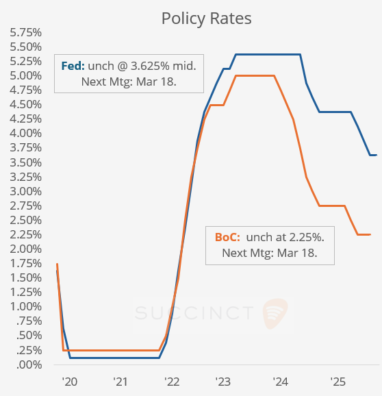 → The Bank of Canada held its policy rate at 2.25% today, as widely expected, and signaled that elevated uncertainty, particularly from US trade policy, makes the timing and direction of its next rate move unclear, keeping options open while affirming the current rate remains appropriate for the outlook. The CAD barely moved today and is 1% stronger YTD.
