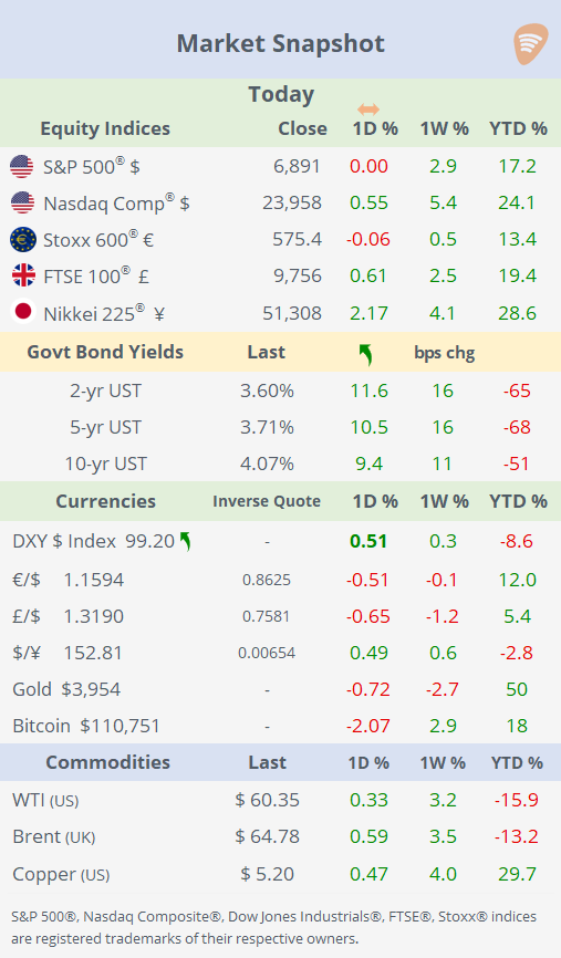 Earnings: Most of today’s action unfolded after the close, with three mega-cap tech names posting mixed results that drove sharp moves in extended trading. Meta beat revenue estimates but reported a one-time $16bn tax charge, sending its shares down 9%. Microsoft and Alphabet both exceeded top- and bottom-line expectations; however, Microsoft slipped 2% after hours, while Alphabet surged as much as 6%. During the regular session, Boeing fell 4% following a wider-than-expected quarterly loss tied to a $5bn charge on its 777X wide-body jet program.
