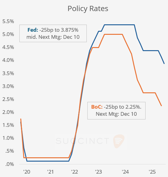 Monetary Policy: → The Fed cut its benchmark interest rate by 25bp to a range of 3.75% to 4% as widely anticipated, marking its second consecutive reduction this year and a drop from a high of around 5.375% fourteen months ago. Despite easing, Fed Chair Powell stressed that a December rate cut is not guaranteed, reflecting a mildly hawkish tone amidst economic uncertainty caused by a data blackout. The Fed also announced it would end quantitative tightening from December. The decision passed with a 10-2 vote, with dissents favouring either no change (Schmid) or a larger half-point cut (Miran). Futures markets now price a 34% chance of no rate change in December, up from 9% yesterday.