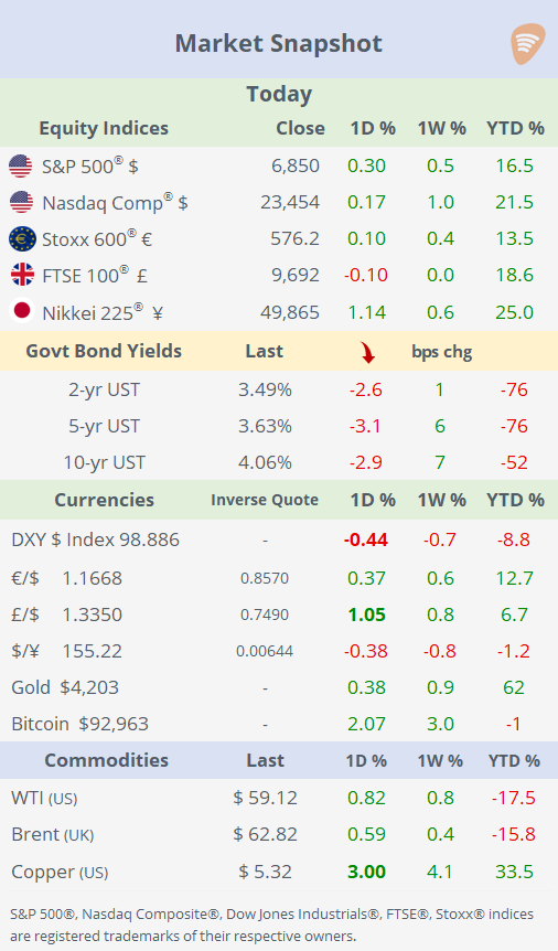 Equity benchmarks finished modestly higher, led by gains in energy and financials, while European markets were little changed. Core bond yields drifted a few basis points lower, with the 10-year Treasury remaining firmly range-bound between 4.0% and 4.15% in recent months.