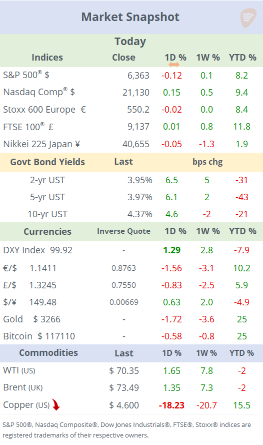 Tariffs: Trump imposed 50% levies on Brazilian imports, excluding orange juice, aircraft, iron ore and fuel products, coming into effect in seven days. He also announced a 25% levy on imports from India, but later said that negotiations were still ongoing. The notable mover was copper, which plummeted 19% today due to Trump's announcement that a 50% tariff will be imposed on semi-finished copper products such as pipes, wires, and cable fittings, but not on refined copper. This unexpected exclusion of refined copper from the tariffs led to a significant market reaction.