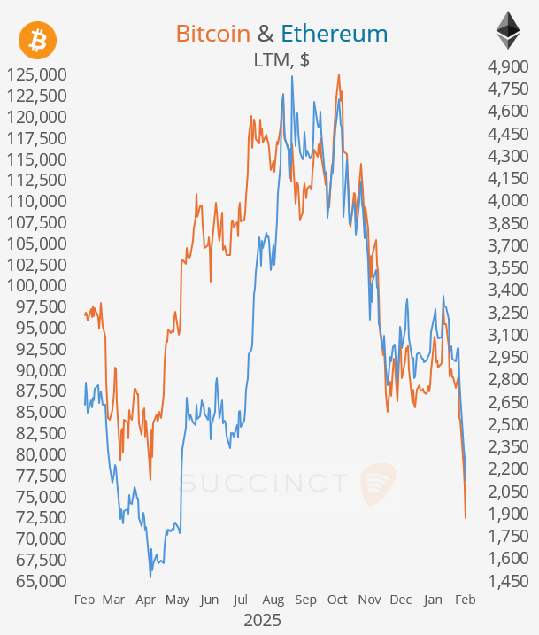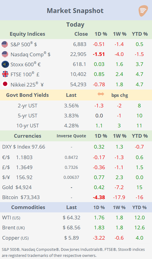Across macro assets, the $ firmed mainly versus the ¥, crypto losses deepened with Bitcoin down 18% in seven sessions to $73,300, and core bond yields were little changed with the 10-year Treasury steady at 4.28%. In commodities, energy prices moved higher, copper fell 3%, and silver jumped 4.5%.