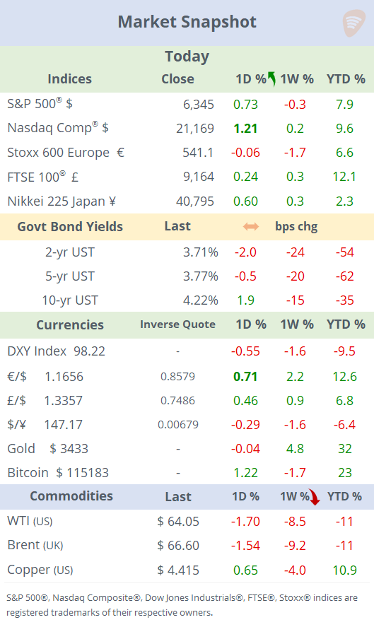 Airbnb (mcap $80bn) reported after the close, beat sales (+13% YoY) and profit estimates, gross bookings grew 11%, it maintained its full-year guidance and launched a $6bn buyback. However, the upbeat Q2 numbers were overshadowed by softer outlook signals and margin caution, and shares fell ~5% in extended trading.
