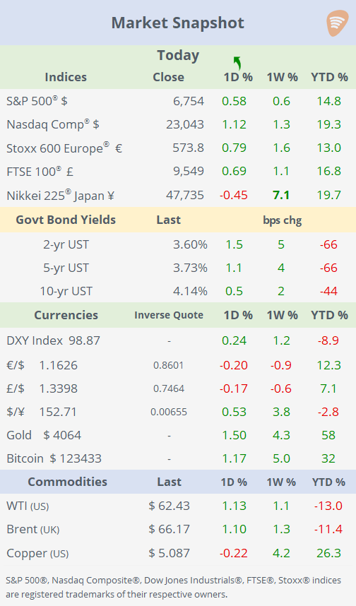 Stocks on Wall Street and Europe rallied on Wednesday, driven by optimism from the Federal Reserve minutes’ dovish tone, boosting risk appetite across equities. The S&P 500 and Nasdaq are again at all-time highs. The tech sector gained on renewed momentum in AI chip stocks due to the recent mega-deals, also fueling investor enthusiasm. Despite the ongoing government shutdown, market confidence remained resilient, showing little impact.