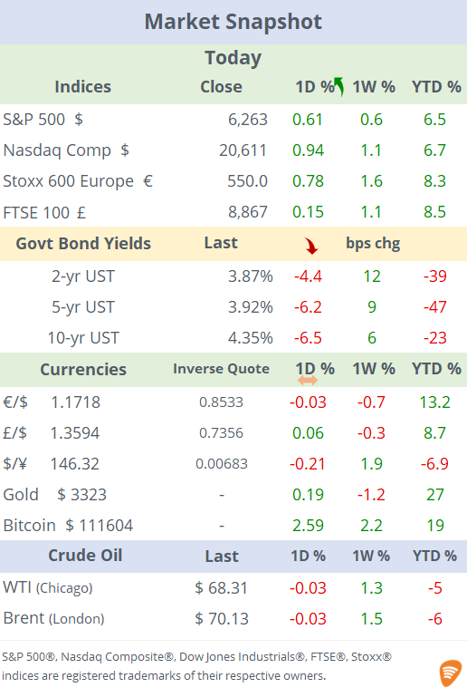 Equity markets finished on a positive note on both sides of the Atlantic on Wednesday with the Nasdaq Composite and the Dax reaching record highs. Nvidia advanced 1.8% but had an intraday all-time high that valued the company above $4tn, a historic record. The VIX Volatility Index dropped below 16% for the first time since February. Bond yields extended their declines after a 10-yr Treasury auction ($39bn) received strong demand. The day’s performance catalysts included the FOMC minutes, new tariff headlines from Trump and deflation in China.