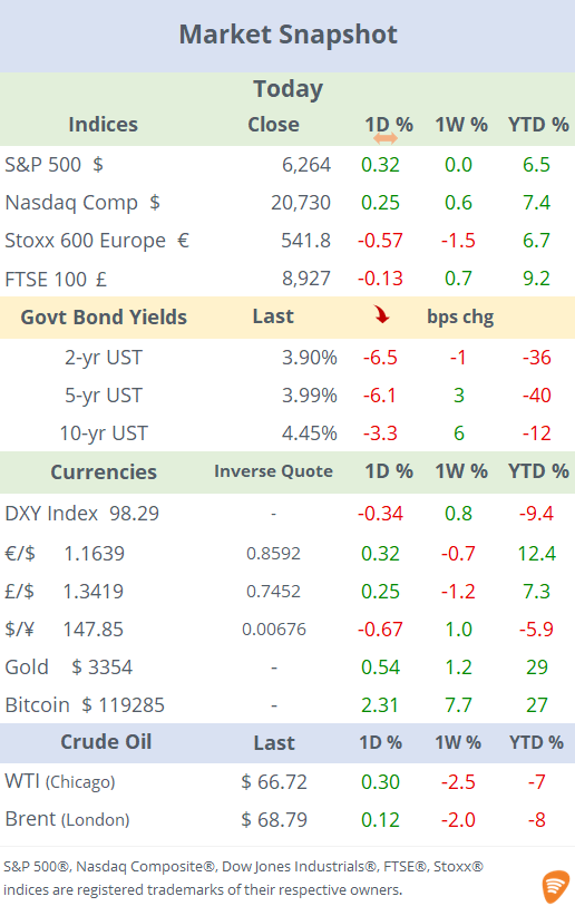 US indices finished slightly firmer on a busy day for data, earnings, and Trump-related headlines. The President denied that he is planning to fire Fed Chair Jerome Powell. Press reports that Trump had discussed with Republicans the dismissal of Powell sent stocks down by 0.8%, but they recovered later following his denial. In Europe, equities fell after ASML disappointed on guidance, pulling the EuroStoxx 50 index lower by 1%.